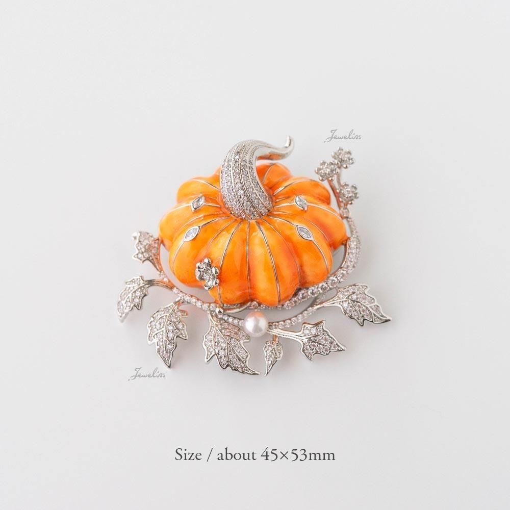 かぼちゃのじくや蔓、葉っぱや花には大小のクリアクリスタルのパヴェを繊細に埋め込み、カボチャにはマーキスカットされたクリアクリスタルが4石セッティングされています。カボチャの下にはやわらかな輝きの淡水パールがあしらわれ、上品さを添えてくれています。